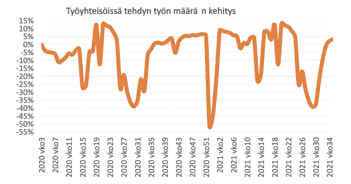 Tehdyn työn kokonaismäärässä tapahtui suuri muutos verrattuna hiihtolomia edeltävään aikaan. Tämä voi kertoa mm. siitä, että työntekijät ja työnantajat ovat voineet sopia nopeasti työajan joustoista tällaisessa poikkeuksellisessakin tilanteessa. Lisäksi työn määrässä näkyvät suuret pudotukset pääsiäisen ja vapun aikoina sekä kesä- ja heinäkuussa, jolloin on pidetty paljon lomia. Syksyn ja loppuvuoden aikana kokonaistyön määrä on noussut asiakasyrityksissämme jopa alkuvuoden lukuja suuremmiksi. Jouluna ja vuodenvaihteessa pidettiin paljon vapaita, mutta heti vuoden 2021 alusta alkaen on aloitettu kiivas työtahti. Lomakaudet sekä arkipyhiä sisältävät viikot näkyvät kokonaistyömäärän tilapäisinä laskuina.