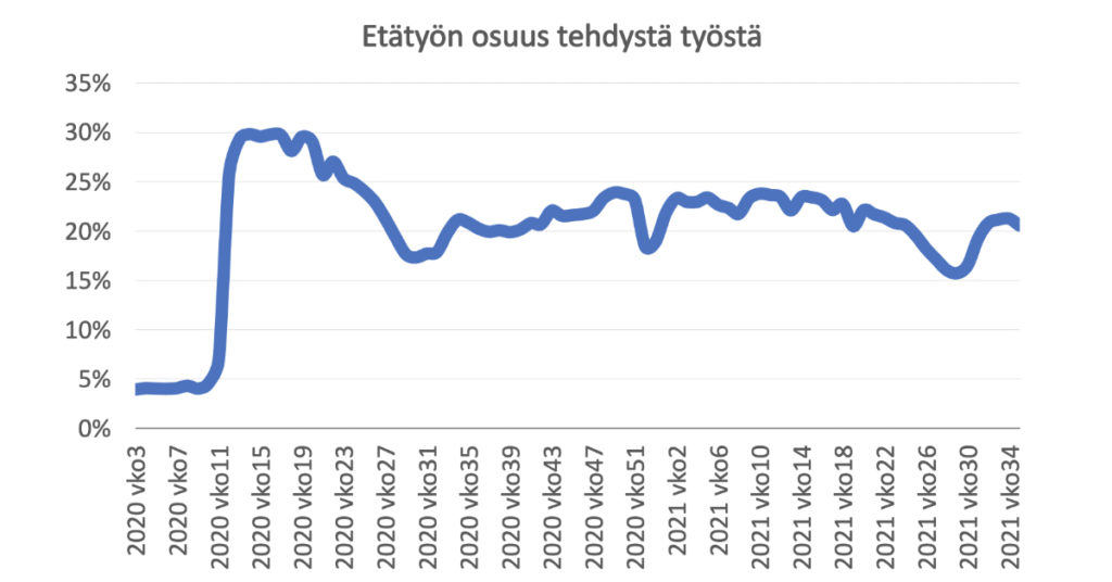 Koronakriisin puhjettua aloimme tutkia sen vaikutuksia etätyöhön. Dataa on kerätty 400 yrityksen ja 50 000 työntekijän todellisista työaikakirjauksista.