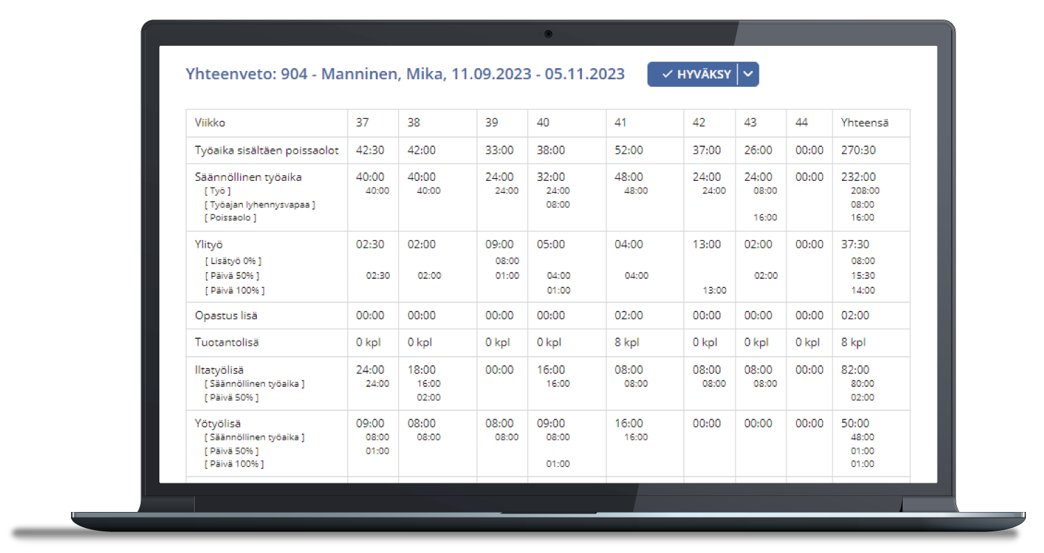 Vuorot, tunnit ja kertymät nähtävillä yhdellä silmäyksellä. Myös mobiilissa.