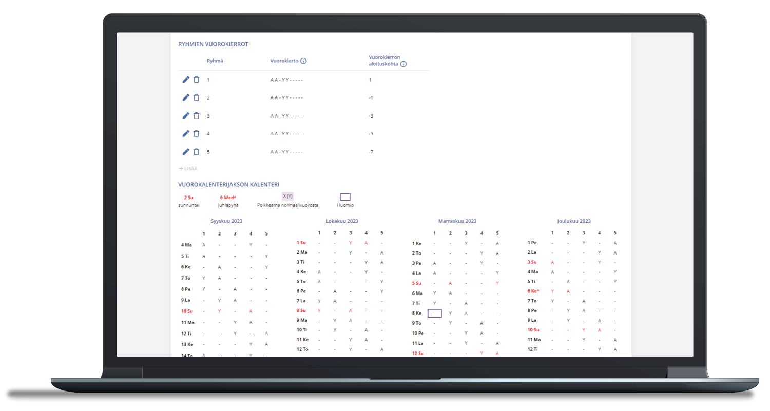 Voit määritellä tarvitsemasi vuorokierron helposti (esim. TAM 35, 37, 25, 27) vuorokalenterille. Kalenterin mukaiset vuorot näkyvät palvelussa selkeästi eri käyttäjäryhmille. Työntekijälle on aina selvää, onko hänellä aamuvuoro, iltavuoro tai yövuoro.