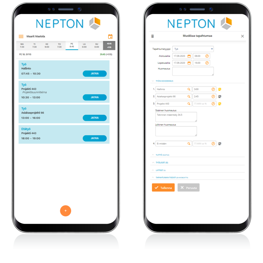 Neptonissa työntekijä kohdentaa omat työaikansa kännykällä eri projekteille. Projektityön voi osittaa myös jälkikäteen tapahtumaa muokkaamalla.