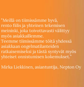 Asiakaspalvelu tekee tiivistä yhteistyötä Neptonin muiden tiimien kanssa. Järjestelmäkehitys on tukena, kun ratkotaan teknisiä tilanteita. Kun projektipäälliköillä on meneillään uusien asiakkaiden käyttöönottoprojekteja, on asiakaspalvelu usein näissä mukana. Asiakaspalvelu toimii koko talon apuna ja tukena erilaisissa tilanteissa. Neptonilla yhteen hiileen puhaltaminen asiakkaiden auttamiseksi ja palvelukokonaisuuden tekeminen asiakkaalle vaivattomaksi on koko liiketoiminnan kärki.