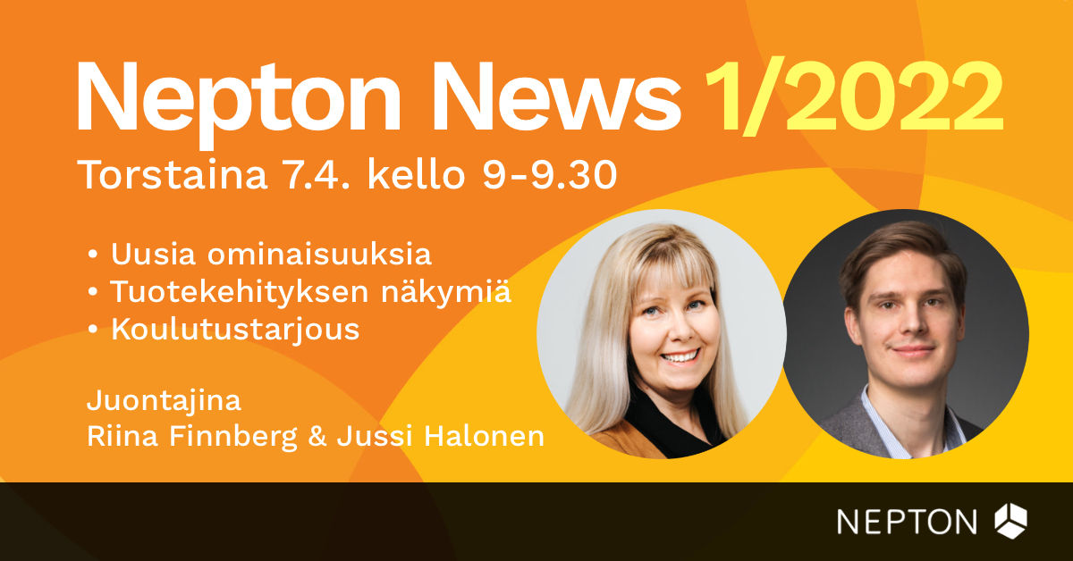 Järjestimme 7.4.2022 webinaarin ajankohtaisista Nepton-kuulumisista. Kiitos kaikille osallistujille! Mikäli et päässyt osallistumaan tai haluat nähdä webinaarin uudelleen, alta voit katsoa webinaarinauhoitteen.