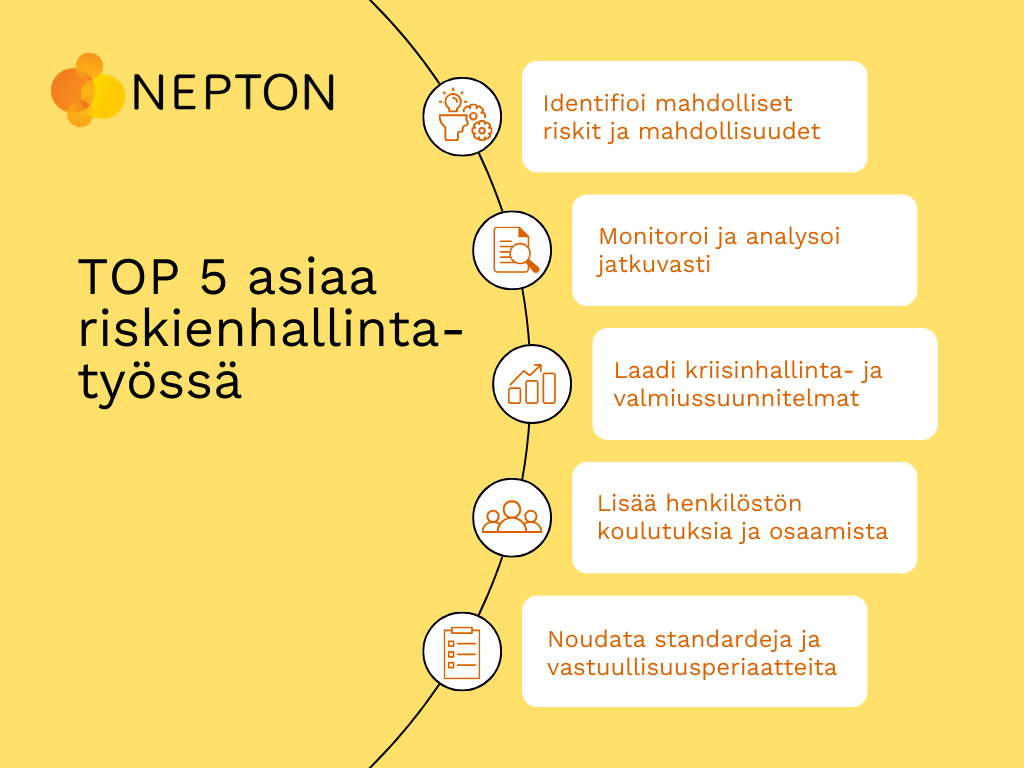 Nepton suorittaa riskienhallintaa säännöllisesti ja systemaattisesti. Se on osa liiketoimintamme jokapäiväistä toimintaa. Olemme kehittäneet kattavan riskienhallintasuunnitelman, joka sisältää kaikki tunnistetut riskit, jotka voivat vaikuttaa liiketoimintaamme. Suunnitelmaa päivitetään, jotta se vastaa ajan tasalla olevia riskejä ja mahdollisuuksia.