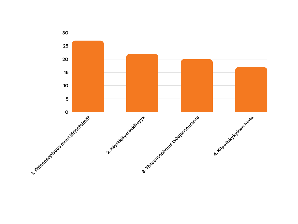 Kysyimme asiakkailtamme myös, mitkä ovat heille tärkeimpiä kriteerejä uutta palkanlaskentajärjestelmää valitessa. Vastaajat pysyivät valitsemaan usean vaihtoehdon, mutta valintaperusteiden tärkeysjärjestys oli Neptonin asiakkaiden mielestä selvä: