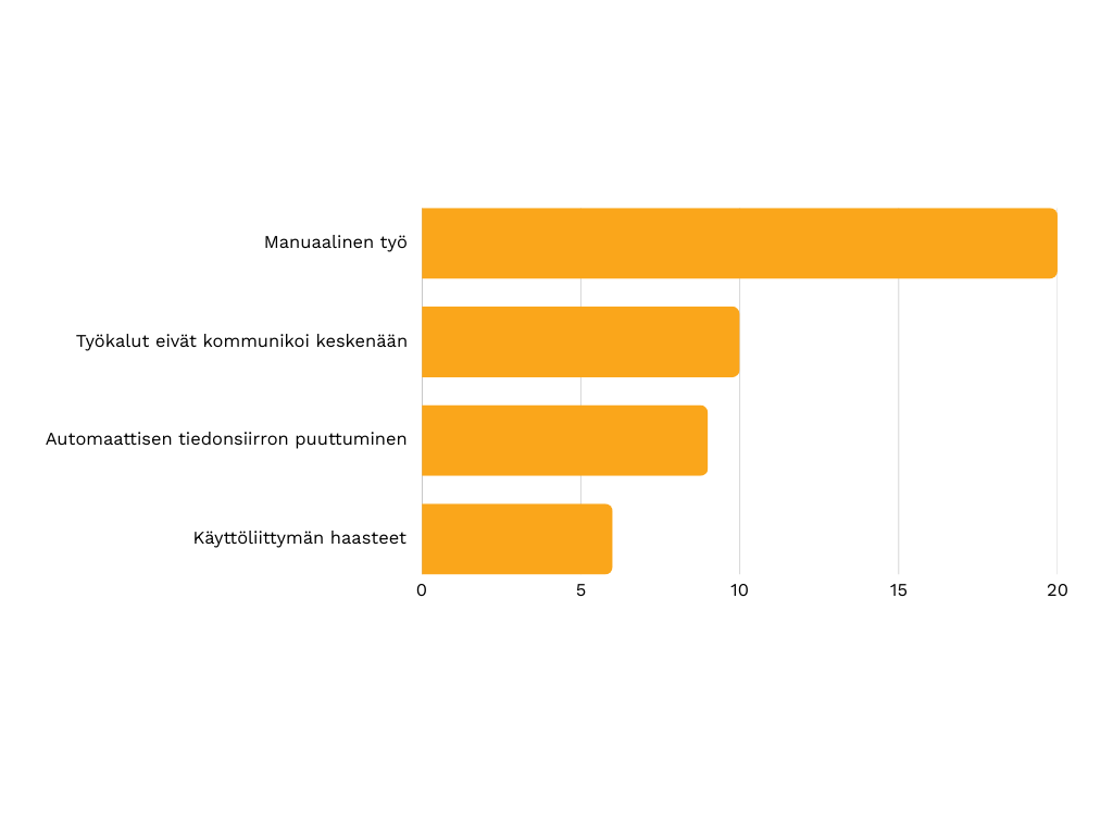 - 21 organisaatiolla ei ole integraatioita, mikä voi aiheuttaa manuaalista työtä ja tehottomuutta